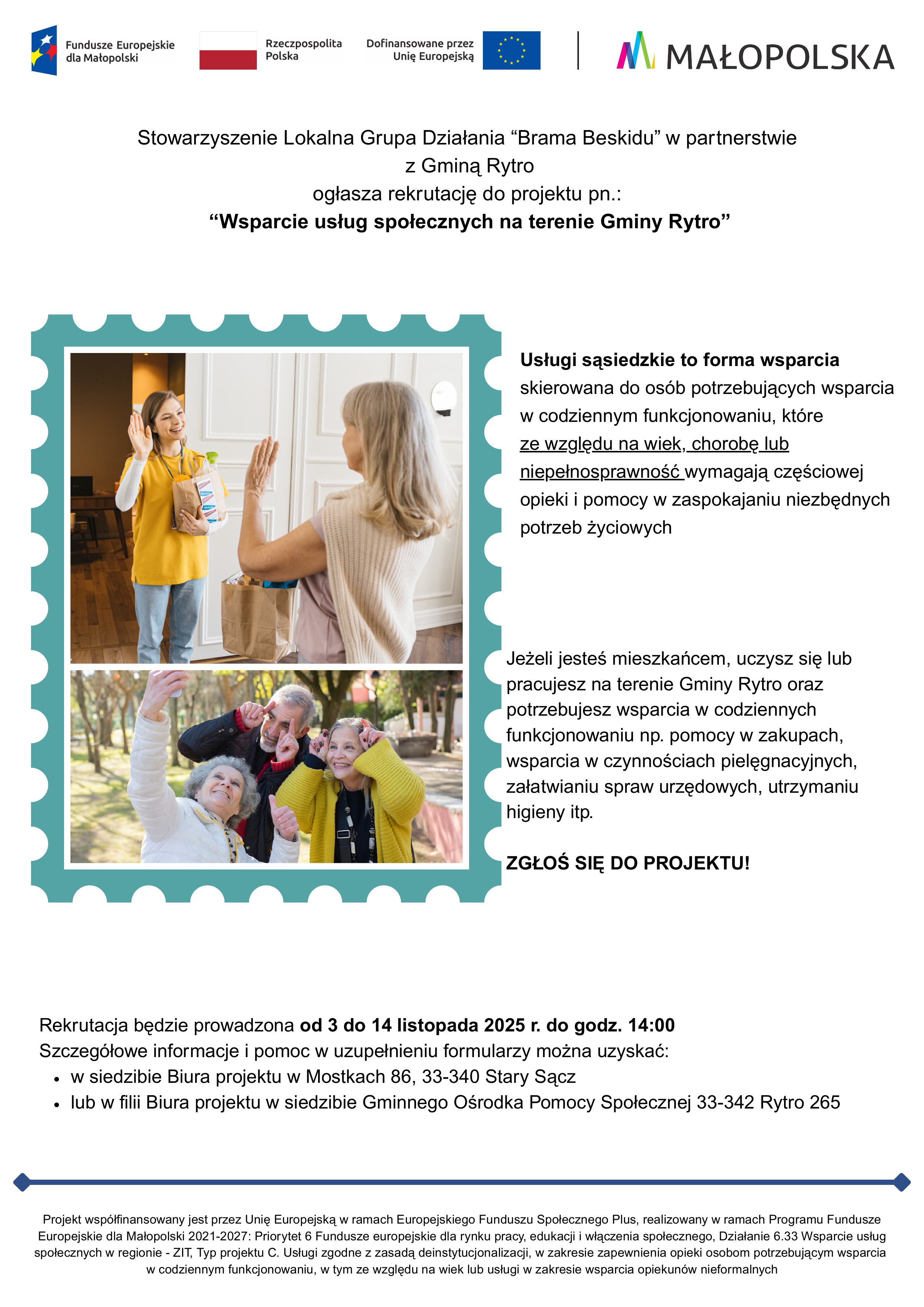 Stowarzyszenie Lokalna Grupa Działania „Brama Beskidu” (Lider projektu) w Partnerstwie z Gminą Rytro (Partner projektu) ogłasza rekrutację do projektu pn. „Wsparcie usług społecznych na terenie Gminy Rytro”.