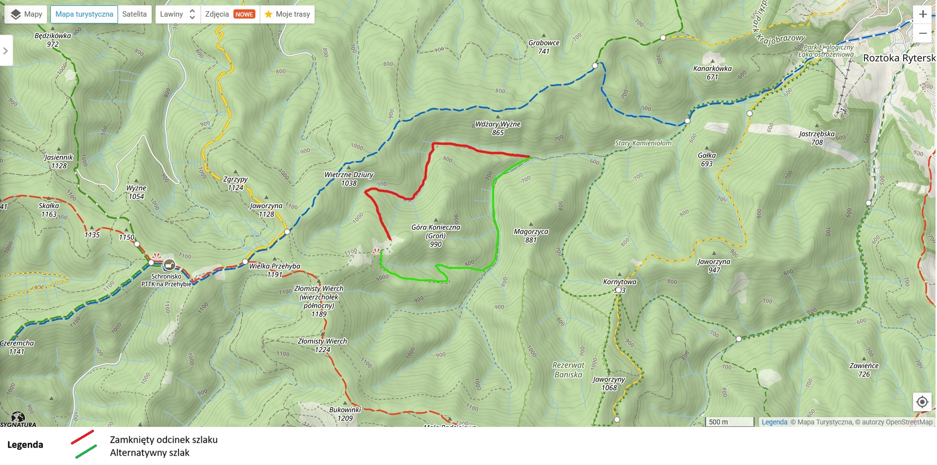 Zalecana trasa alternatywna: obejście zamkniętych odcinków szlaku niebieskiego